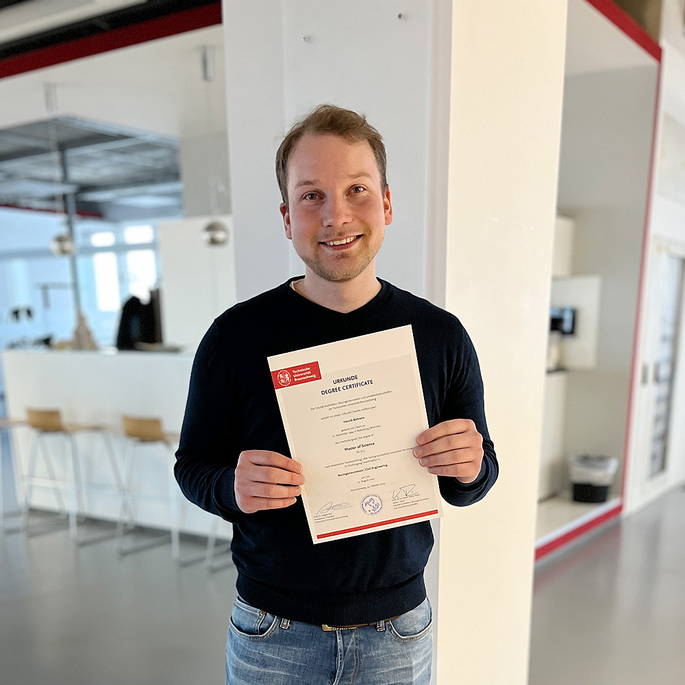 Am 4. Dezember wurde es offiziell: Henrik hat seine Urkunde zum Master of Science im Bauingenieurswesen erhalten und hat damit sein Studium an der TU Braunschweig nach 6 intensiven Semestern während der Corona-Pandemie beendet.